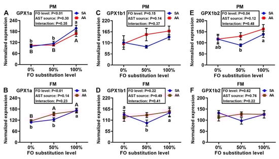 Effects of dietary fish oil substitution by DHA-rich microalgae and source of astaxanthin on hepatic mRNA levels of GPX1a (A,B), GPX1b1 (C,D), and GPX1b2 (E,F) of juvenile rainbow trout fed the plant meal- (PM, A,C,E) and fishmeal (FM, B,D,F)-based diets. Means labelled with different letters [lowercase (a, b), synthetic astaxanthin (SA) groups; uppercase (A, B), microalgae astaxanthin (AA) groups] are different between various fish oil substitutions (p < 0.05). The absence of different letters (a, b or A, B) between means indicates no significant differences. GPX: glutathione peroxidase. FO: fish oil. AST: astaxanthin.