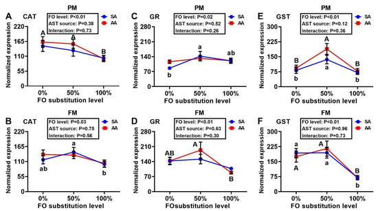 Effects of dietary fish oil substitution by DHA-rich microalgae and source of astaxanthin on hepatic mRNA levels of CAT (A,B), GR (C,D), and GST (E,F) of juvenile rainbow trout fed the plant meal- (PM, A,C,E) and fishmeal (FM, B,D,F)-based diets. Means labelled with different letters [lowercase (a, b), synthetic astaxanthin (SA) groups; uppercase (A, B), microalgae astaxanthin (AA) groups] are different between various fish oil substitutions (p < 0.05). The absence of different letters (a, b or A, B) between means indicates no significant differences. CAT: catalase; GR: glutathione reductase; GST: glutathione S-transferase. FO: fish oil. AST: astaxanthin.