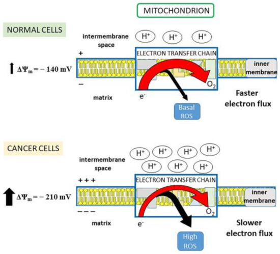 Mitochondria are considered the major production site of ROS, generated through the electron transport chain (ETC). The free energy made available by the electron transfer drives a proton-motive force (pmf) across the inner mitochondrial membrane. As protons are positively charged, pmf determines a charge gradient which constitutes the inner mitochondrial membrane potential (Δψm). When the Δψm is high, like in cancer cells, the electron transfer is slowed down, as protons have to be pumped against an enhanced electrochemical force, so that an electron leakage and, consequently, high ROS production are favored [47] (Figure 1). By lowering the Δψm toward that of normal cells, the electron flow would accelerate with the result that (i) electrons spend less time in ETC, thus decreasing their chance of reducing oxygen to superoxide radical; (ii) the increase in oxygen consumption due to the faster electron transfer limits free oxygen availability for superoxide generation [47]. In this regard, tumor cells have a more negative mitochondrial membrane potential inside the matrix (Δψm ~ −210 mV), than normal cells (Δψm ~ −140 mV) [28,48] (Figure 1).