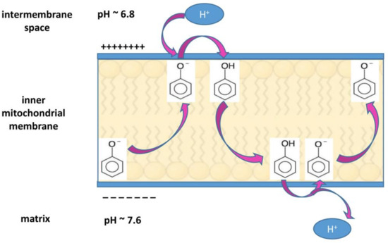 The alterations in proton concentration imply serious consequences in the cellular functions. The acidification of extracellular tumor microenvironment contributes to enhance invasiveness and metastatic spread, suppress immune responses and induce chemotherapy resistance, whereas the cytosolic alkalization favors cell proliferation, protects from apoptosis, and supports tumor neo-vascularization by promoting VEGF expression [74,81,83,84,85]. It has been observed that, if the dysregulation of proton concentration is reversed by inhibiting NHE1 transporter activity, the resulting intracellular acidification contributes to cell death via apoptosis [85,86,87]. Reciprocally, the observation that upon exposure to apoptotic stimuli, an intracellular acidification occurs in mammalian cells undergoing apoptosis [87] confirms the strong relationship between acidic pHi and apoptosis pathway [88]. As counteracting pHi increase and Na+ overload reverts cancer cell phenotype, it is worth to highlight that the use of proton and ion transporters inhibitors such as ameloride, cariporide and other synthetic inhibitors, can be a new promising therapeutic approach against tumor development [78,83]. In this regard, also some natural products can affect pH-regulating ions channels. For instance, ginsenoside induces apoptosis in hepatocellular carcinoma by decreasing NHE1 expression and activity, via EGF/ERK/HIF-1 signaling pathway [89]. Ellagic acid markedly down-regulates ROS formation and NHE1 expression leading to decreased NHE1 activity, pHi, glucose uptake and lactate release in endometrial cancer cells [90]. Corncob extract decreases proliferation and viability in glioma cells by reducing ROS amount, Bcl-2, and lactate monocarboxylate transporter 1 expression levels [91]. Moreover, the increase in plasmatic and mitochondrial membrane proton conductance could represent an alternative mechanism by which natural compounds can restore pH homeostasis without affecting a specific ion channel, but still allowing protons re-entry into the cytosol or the mitochondrial matrix. For instance, in the mitochondria, any compound acting to decrease differences in pH across the membrane, lowers Δψm and can also cause uncoupling of the electron flow with the oxidative phosphorylation [92]. In general, lipophilic, weakly acidic compounds can work as protonophores [92]. Due to their lipophilicity, they enter and remain in the membrane in which they can shuttle from one membrane-water interface to the other. For their weakly acidic nature, they can assume either the neutral state or the anionic form. In the latter form, stabilization occurs by delocalization of negative charge by resonance, so that their lipophilicity is not compromised. A protonophore in anionic form (e.g., a phenolate) is attracted by the positive side of the membrane-water interface close to the intermembrane space (where the pH is 6.8). There, it can bound a proton and move to the other membrane-water interface close to the matrix, where it releases the proton, due to the negative charge on this side of the membrane and the high pH (7.6) of the matrix. Then, it comes back for another cycle [28,92] (Figure 2).