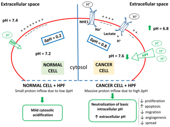 It should be reminded that in normal cells proton concentration is slightly higher in cytosol (pHi ~7.2) than in extracellular space (pHe ~7.4) [83]. Conversely, in tumor cells pHi increases to ~7.6 and pHe decreases to ~6.8, thereby reversing the pH gradient (ΔpH) direction. Such pH dysregulation, that occurs early in cancer development, is further exacerbated during tumor progression [83].