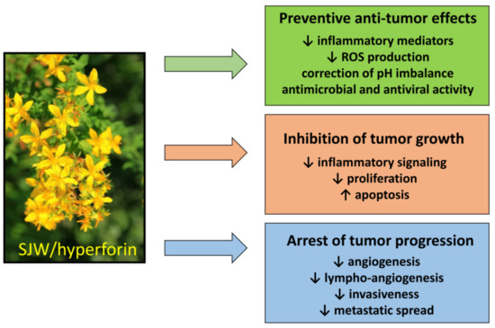 - Tumor prevention. Regular use of SJW reduces cancer risk, by preventing the genotoxic effect of carcinogens [144]. This protective action is essentially based on the ability of HPF to slowdown inflammatory mediators and regulate ROS production and/or pH imbalance, resulting in counteraction of malignant phenotype. It should be emphasized that preventive dietary supplementation of SJW has been found to reduce the risk of colorectal cancer also in humans [156].