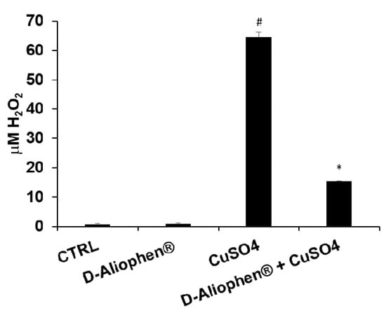 Protective effect of Aliophen® against low-density lipoprotein (LDL) oxidation. LDL were incubated for 15 min in the presence of 0.25 mg/mL (w/v) of D-Aliophen®, before the addition of 50 µM CuSO4. After the treatment FOX assay was performed to determine the level of peroxide (like H2O2), produced following LDL oxidation. Bar graphs represent the mean ± SD. Symbols indicate significance: (#) p < 0.005 vs CTRL and (*) p < 0.005 vs CuSO4.