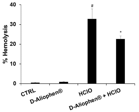 To verify the potential protective effects of Aliophen® on the redox homeostasis in human erythrocytes, we treated RBC (red blood cells) isolated from healthy donors with HClO, which results in rapid oxidation of reduced glutathione, increases in cell osmotic fragility, and formation of transient membrane pores with the consequent hemolysis [56]. The isolated erythrocytes were stimulated with 0.3 mM HClO, a concentration in the same order of magnitude as that generated in vivo under pathological conditions [56], resulting in about 33% hemolysis (Figure 3). The pretreatment of RBC with 1 mg/mL (w/v) D-Aliophen® for 45 min induced a significant, protective effect against HClO-induced hemolysis. Moreover, D-Aliophen® treatment was not hemolytic per se (Figure 3).
