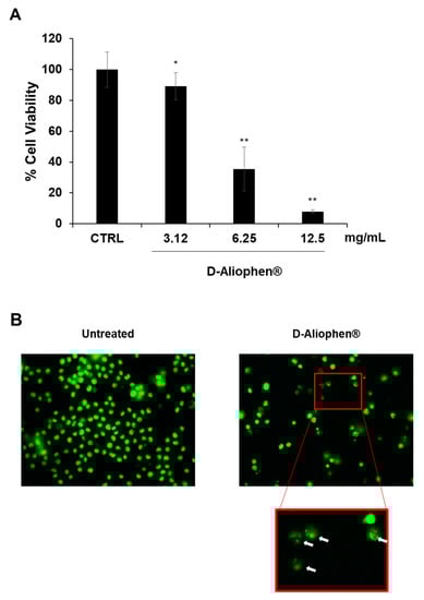 Aliophen® reduces cell viability in HL-60 cells. (A) Cells were treated for 20 h at indicated concentration of D-Aliophen®, and cell viability was assessed using CyQuant as described in Materials and Methods. Bar graphs represent the mean ± SD. Symbols indicate significance vs. untreated cells (CTRL) with * p < 0.05 and ** p < 0.005. (B) Representative images of cells untreated (left) and treated for 20 h with 12.5 mg/mL D-Aliophen® (right) and stained with CyQuant nuclear stain. Cells were visualized using a fluorescent microscopy and photographed in an FITC filter with 400× magnification. The arrows indicate the presence of apoptotic bodies.