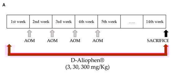 A preliminary test was performed administering to the mice for 5 days D-Aliophen® at 0.3, 1, 5, and 10 g/kg doses to measure acute toxicity (body weight, hair loss, death, etc.). The doses of 5 and 10 g/kg caused the death of animals after 4 days, while doses of 0.3–1 g/kg induced a reduction of body weight compared to controls (data not shown) being significant only at 1 g/kg. Based on these preliminary data, the maximum dose of D-Aliophen® administered to AOM mice has been 300 mg/kg.