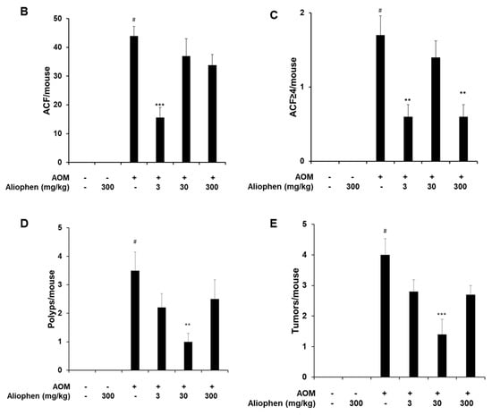 Effect of D-Aliophen® against early preneoplastic lesions (aberrant crypt foci, ACF), polyps, and tumors induced in the colon of mice by azoxymethane (AOM) (A). Experimental design. Effect of D-Aliophen® (3–300 mg/kg) on the formation of ACF (B), ACF ≥ 4 (C), polyps (D), and tumors (E) induced in the colon of mice by AOM (10 mg/kg). D-Aliophen® was orally administered five times a week. The measurement of the parameters was performed 13 weeks after the first injection of AOM. Bar graphs represent the mean ± SD. Symbols indicate significance: # p < 0.01 or 0.001 vs. untreated, ** p < 0.01 and *** p < 0.001 vs. AOM (n = 5–10 mice).