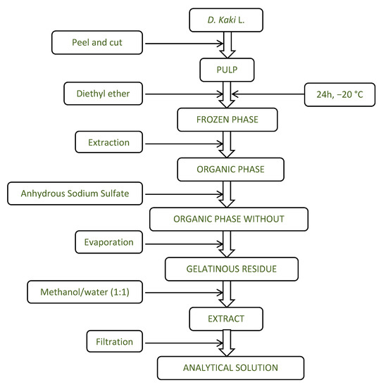The method used for sample treatment was described by Moreno-Montoro et al. [30] with some changes described by Esteban-Muñoz et al. [29], which used diethyl ether instead of acidic methanol to extract phenolic compounds from different fruit matrixes. An amount of 20 mL of diethyl ether was briefly added to persimmon (100 g of homogenized pulp) and the resulting solution was frozen at −20 °C for 24 h. Then, the mixture was centrifuged for 10 min at 9000 rpm. The supernatant was transferred to a separatory funnel and three extractions were made with 20 mL diethyl ether. A spatula tip of anhydrous sodium sulfate was added to the organic extract, filtered, and evaporated under rotary evaporation at 30 °C to the smallest possible volume. The extracts were filled to 1 mL with a methanol/water mixture (1:1), filtered through a 0.20 μm membrane filter, and passed to the chromatography vial for analysis. The procedure is shown by Figure 1.