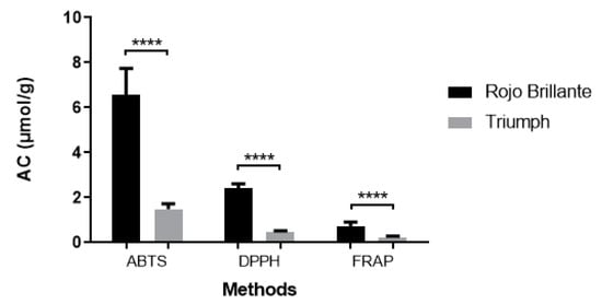 Evaluation of the antioxidant activity (AC) of the Rojo Brillante and Triumph varieties measured by ABTS, DPPH, and FRAP assay. **** Indicates p < 0.0001.