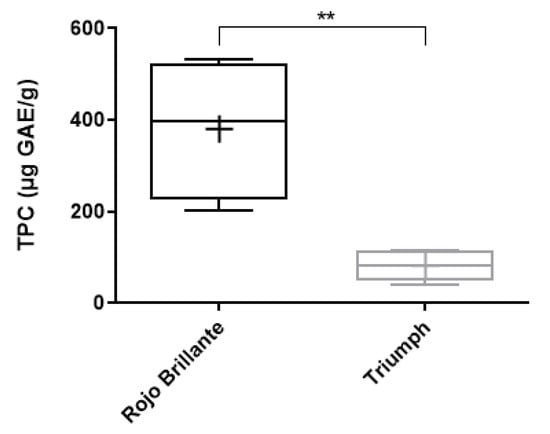 Quantification of the total phenolic compounds (TPC) in µg GAE/g of two persimmon fruit varieties (Rojo Brillante and Triumph). ** Indicates p < 0.01.