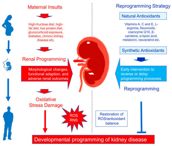 The above-mentioned evidence supports that maintaining a physiological oxidative-antioxidative balance is advised to prevent developmental origins of kidney disease. However, there are many aspects still unsolved. At face value, it would be logical to consider early-life antioxidant interventions in potential reprogramming therapies for kidney disease of developmental origins. However, it is noteworthy that excessive antioxidant supplement may shift oxidative stress to an opposite state of “antioxidant stress” [126]. That is, perinatal antioxidant supplement would only apply in the case of deficits, but not as a usual intake.