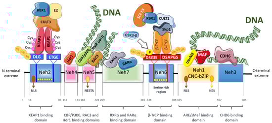 Nrf2 is a member of the basic region leucine zipper (bZIP) family of transcription factors, and more exactly to the cap‘n’collar (CNC) subfamily. Nrf2 has seven structural domains (Neh1 to Neh7) that have different functions [15] (Figure 1). The Neh1 domain is constituted by a CNC-bZIP region that interacts with DNA and the small musculoaponeurotic fibrosarcoma (sMaf) proteins [16]. sMaf proteins dimerize with Nrf2 and they help Nrf2 to bind to the DNA. Moreover, this domain interacts with the E2 ubiquitin-binding enzyme UbcM2 (an E2-type ubiquitin-binding enzyme) to regulate the stability of Nrf2 [17] and allows DNA binding and modulation of numerous genes through its association with ARE (antioxidant response element) sequences in specific gene promoter regions [18]. The Neh2 domain contains the DLG (low-affinity) and ETGE (high-affinity) motifs that facilitate the binding of Nrf2 to its negative regulator Kelch-like ECH-associated protein 1 (Keap1). Moreover, the Neh2 domain also comprises seven lysine residues whose ubiquitination promotes Nrf2 proteasomal degradation [19,20]. The C-terminal domain (Neh3) participates in transcriptional activation of Nrf2 via interaction with the chromodomain helicase DNA binding protein 6 (CHD6) [21]. Moreover, the Neh3 domain in association with the Neh4 and Neh5 domains mediates functions related to the transcription of Nrf2 target genes [21,22]. Moreover, the Neh4 and Neh5 domains induce Nrf2 acetylation via interaction with CREB binding protein (CBP) [23]. In contrast, the serine-rich region of the Neh6 domain negatively regulates Nrf2 half-life by a Keap1-independent mechanism. Specifically, the DSGIS and DSAPGS motifs of Neh6 are recognized by β-TrCP (β-transducing repeat-containing protein), a protein involved in Nrf2 proteasomal degradation [24]. The Neh7 domain plays a role in the repression of Nrf2 transcriptional activity through a physical association with the retinoid X receptor α (RXRα). RXRα inhibits the binding of CBP to the Neh4 and Neh5 domains, resulting in decreased expression of Nrf2 target genes [25].