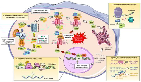 The regulation of Nrf2 activation status is complex and multifactorial because many injurious triggers, such as oxidative stress, activate this transcription factor and diverse cellular processes determine its expression (Figure 2). Although the main form of regulation of the Nrf2 pathway is the aforementioned modification of Keap1 cysteines, there are other forms of regulation of this pathway at the transcriptional, post-transcriptional, translational, and post-translational level: