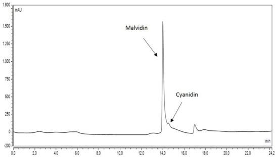 The elution of açai extract obtained as described in the Methods section showed a profile similar to the one reported by Petruk et al. [3]. The elution time of the peak known to be representative for the bioactive molecules (malvidin and cyanidin, [3]) is consistent in our chromatographic profile (Figure 1) respect to the published data. Only minor changes in the profile were evidenced for the main peak area, that were possibly due to the different dimension of the column section and the consequently a higher flow rate, and also a higher methanol content in the loaded sample.