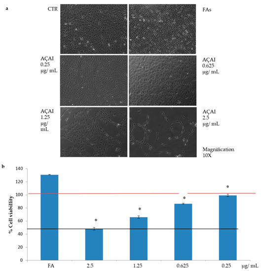 Viability of steatotic HepG2 cells in the presence of açai extract. After 24 h of FAs incubation, cells were treated with increasing concentrations of açai extract (from 0.25 to 2.5 µg/mL) for other 24 h. (a) Images of cells obtained by optical microscopy, 10× magnification; (b) Viability, assessed by Presto Blue reagent, is expressed as percentage with respect to untreated cells (indicated by the red line). The black line indicates the 50% of cell viability. * p < 0.05 for all the acaj added samples vs FA. Treatment with 0.25 µg/mL acaj extract proved the same cell viability than untreated control. Only 2.5 µg/mL treatment reduced viability of 50% respect to control, showing a certain cytotoxicity.