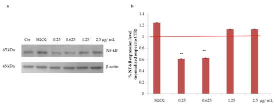Hydrogen peroxide (H2O2) challenge is known to induce oxidative stress as well as inflammation in HepG2 cells [15]. Thus, NF-kB, a well-established inflammatory marker, was analysed by Western blotting in HepG2 cells challenged with H2O2 and then treated with açai extract. As shown in Figure 4, a significant reduction in NF-kB level was observed upon treatment with açai extract (** p < 0.01 with respect to control) at the lowest concentrations tested (0.25 and 0.625 µg/mL). No protective effect was observed at the highest concentration tested, probably because of the cytotoxic effect of açai extract observed at these concentrations (Figure 2).