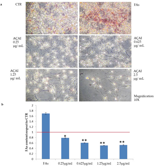 Effects of açai extract on in vitro induced steatosis on HepG2 cells. (a) Oil Red O staining images of steatotic HepG2 cells, and control (first image on the left). (b) Spectrophotometric quantification of lipids in HepG2 cells treated with açai extract at different concentrations (from 0.25 to 2.5 μg/mL) with respect to HepG2 control cells. Values are expressed as means ± S.D of independent experiments (n = 3). The red line is relative to control cells. * indicates p < 0.05; ** indicates p < 0.01.