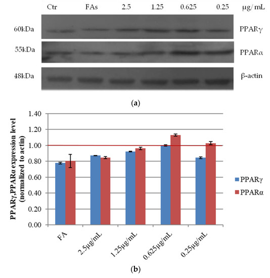 Adipogenesis requires the activation of several transcriptional factors, among which the peroxisome proliferator-activated receptor γ (PPARγ). As PPARα/γ [21] are at the center of the adipogenic cascade [22] and key terminal adipogenic regulators [23], their expression was evaluated in our experimental system. As shown in Figure 5, upon treatment with increasing amount of açai extract, PPARα/γ expression increased at the lowest concentration tested. On the other hand, the higher was the concentration of the extract, the lower the protein expression levels (Figure 5). This result may suggest that the impairment of cell viability induced by the extract in certain conditions affects also cell lipid metabolism (Figure 1). This evidence suggests that açai extract displays a hormetic action, similarly to other natural antioxidants (e.g., resveratrol) [24].