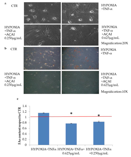 Lipid accumulation was detected with Oil Red staining on adipocyte cells treated with TNF-α (10 ng/mL) in hypoxic condition with respect to control cells (Figure 6). Interestingly, also on this cell model, açai extract efficiently reduced fat deposit (* p < 0.05), even at low concentrations reduced efficiently fat deposit (* p < 0.05) as shown in Figure 7.