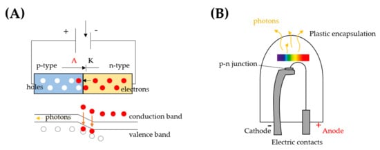 An LED is a solid-state semiconductor diode, allowing unidirectional current flow from the anode to the cathode within a specific voltage range. The diode is composed of two differently doped materials that jointly form a p-n heterojunction, where the p-side contains excess positive charge (holes), while the n-side contains excess negative charge (electrons). When a positive forward voltage is applied, the current flows from the p-side to the n-side and electrons are forced to move from the n-side toward the p-side, whilst holes make the reverse path. As an electron crosses the depletion layer, near the junction, it recombines with a hole and falls from the conduction band in a lower energy level, the valence band, and releases energy in the form of a photon (Figure 1A). The effect is a form of electroluminescence and incoherent narrow-spectrum light is emitted.
