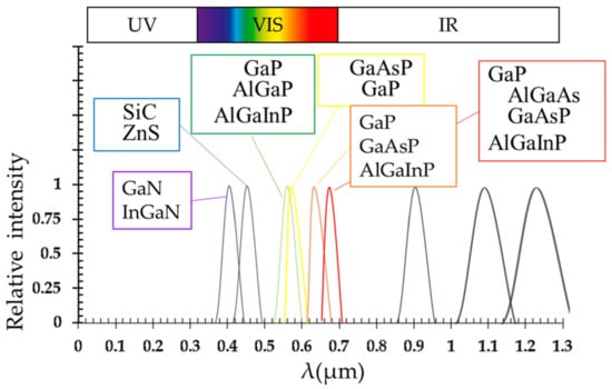 The emitted light wavelength, so its color, depends on the band gap energy of the junction’s materials [23,24]. The band gap represents the minimum energy difference between the top of the valence band and the bottom of the conduction band; it depends on the dopants used in the p- and n-sides. An LED is usually made by direct band gap semiconductors, so the top of the valence band and the bottom of the conduction band occur simultaneously; in this way, the probability that an electron spontaneously recombines with a hole is high.