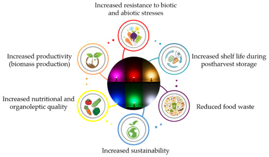 Overall, understanding the physiological responses induced by LED lights is a crucial step to regulate plant morphogenesis, enhance the nutritive value of crops, and preserve quality in postharvest fresh products. However, data from the literature are often contradictory because, over the years, many research projects focused their efforts on a few selected species or cultivars, and little is known about the comparison among closed species, more cultivars, or types of the same cultivar [22,169,200,201]. Eventually, further efforts should be devoted to including harmonized LED metrics and to comparing different light qualities and intensities in the same experimental design.