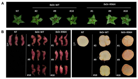 Phenotypic analysis of transgenic sweetpotato plants overexpressing IbOr-WT and IbOr-R96H. (A) Photographs of aerial plant parts of 1-month-old NT, IbOr-WT, and IbOr-R96H plant lines. (B) Comparison of storage roots of 4-month-old pot-grown NT, IbOr-WT, and IbOr-R96H plants. Photographs show whole storage roots (left) and cross-sections of storage roots (right).