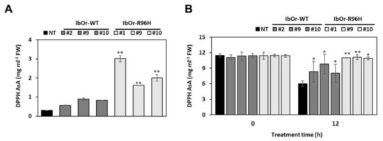Previously, IbOr-WT transgenic sweetpotato calli exhibited increased antioxidant activity and salt stress tolerance. Furthermore, IbOr-R96H transgenic calli also showed enhanced tolerance to salt and heat stresses [31,33]. To investigate the antioxidant activity in transgenic sweetpotato, we analyzed the DPPH radical scavenging activity in fresh storage roots and leaves of NT, IbOr-WT, and IbOr-R96H plants (Figure 6). In storage roots, the DPPH radical scavenging activity was 5.5–10.2- and 1.9–3.0-fold higher in IbOr-R96H and IbOr-WT transgenic plants, respectively, than in NT plants (Figure 6A). Additionally, in contrast to the normal (no stress) condition, the DPPH activity in IbOr-R96H leaves was up to 1.85-fold higher than that in NT leaves after 12 h of heat stress treatment (Figure 6B).