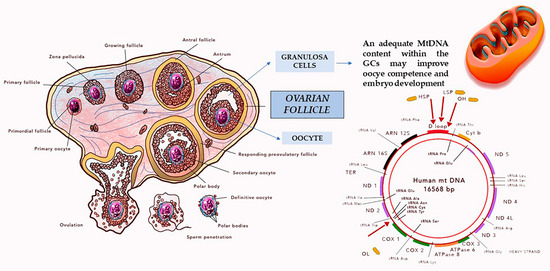 More recently, Lan et al. focused on the association between the mtDNA copy number of CGCs and the maturation of oocyte cytoplasm. Results showed that the mtDNA content of CGCs decreases from the germinal vesicle (GV) phase to the metaphase I (MI) phase and it does not undergo changes from the MI to MII stage [51]. At different oocyte maturation stages, the CGCs mtDNA may self-degrade and replicate to meet the energy requirements of the corresponding oocyte [49,51].