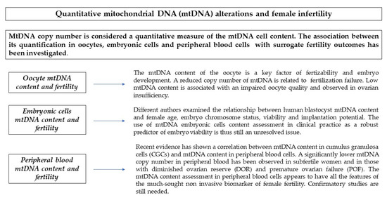 MtDNA copy number is considered a quantitative measure of the mtDNA cell content. This biomarker attracted the attention of reproductive medicine researchers. In particular, the association between its quantification in oocytes, GCs, embryonic cells, and peripheral blood cells with surrogate fertility outcomes such as the embryo implantation and pregnancy rates has been extensively investigated (In this scenario, IVF emerged as the ideal study model.