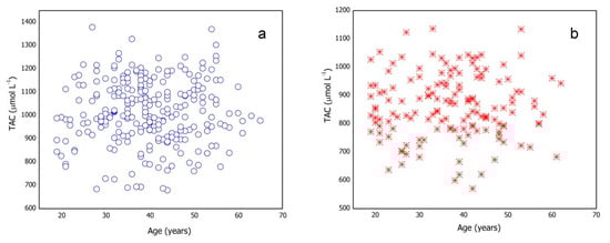 Total antioxidant capacity (TAC) values vs. age for (a) male and (b) female subgroups.