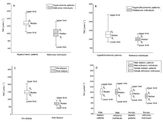 Box-whiskers plots of TAC values for pathological patients. (A): hyperuricemic patients; (B): hyperbilirubinemic patients; (C): dialysis patients; (D): diabetic patients.