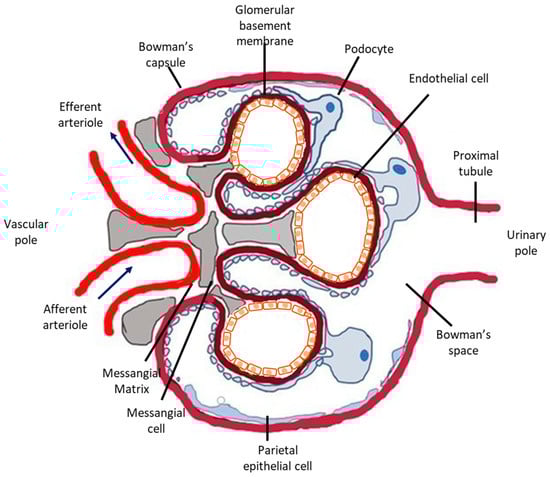 The glomerular microvasculature is particularly vulnerable to injury, including immune-mediated, metabolic, and oxidative forms, partly because of its highly specialized structure and function. Briefly, nephrons, the urine-producing units of the kidney, consist of the glomerulus (Figure 1), a tricellular structure, surrounded by the glomerular (Bowman’s) capsule and a tubule comprising highly specialized segments performing primarily reabsorptive and secretory functions. Glomeruli form a complex and extremely developed microvascular bed, the glomerular tuft, the main function of which is highly selective plasma filtration while retaining high-molecular-weight molecules and cells in the circulation. Three different cells types comprise the glomerular tuft (Figure 1). Endothelial cells line the luminal side of the glomerular basement membrane (GBM), epithelial cells (or visceral epithelial cells), also known as podocytes, are terminally differentiated post-mitotic cells anchored on the outer surface of the glomerular basement membrane (facing the Bowman’s space) and mesangial cells primarily support the capillary loops.