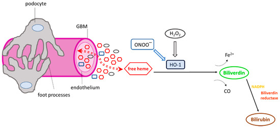 A number of independent observations on the role of the heme–HO-1 axis in the kidney have emphasized the renoprotective effect of HO-1 induction [10,11]. HO-1 induction or upregulation has been reported in glomerular diseases, including IgA nephropathy [12], minimal change disease [12], and sickle cell nephropathy [13]. Interestingly, although these diseases commonly attack the glomerular microvasculature, the above studies demonstrated prominent HO-1 induction primarily in renal tubular but not in glomerular cells. This was confirmed in experimental models of glomerular injury in which potent HO-1 inducers such as cytokines and pro-oxidant radicals, including superoxide (O2−), hydrogen peroxide (H2O2), and peroxynitrite (ONOO−), are overproduced in the glomerular milieu. Contrary to expectations, robust HO-1 induction was consistently found not in intrinsic glomerular cells but at tubular sites “downstream” of the glomerular capillary [14,15].