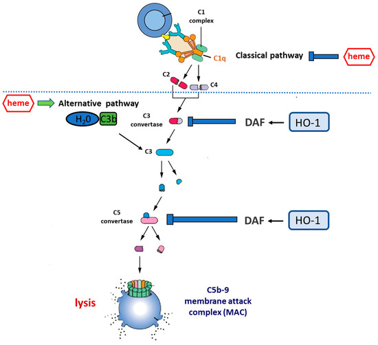 Complement cascade regulation by the heme–HO-1 axis. Central to the activation of complement is the cleavage of circulating C3 to form C3a and C3b. This occurs spontaneously at a low rate in circulation but can be accelerated by: (i) the classical pathway, in which antibodies bound to antigen recruit the C1 complex which, via the activation of circulating C4 and C2, increases the rate of C3 cleavage at the antibody-coated surface; (ii) the alternative pathway (AP), in which C3b binds to circulating factor Bb to form the C3bBb complex that is stabilized by the presence of a biological surface and provides a mechanism for positive feedback, allowing massive C3 activation. Uncontrolled C3 activation is prevented by cell surface regulators, including decay-accelerating factor (DAF, CD55) and membrane co-factor protein (MCP, CD46). C3b generation promotes the cleavage of circulating C5 to form C5a and C5b. C5b generation activates the terminal pathway, in which C6–C9 are recruited to form the membrane attack complex (C5b-9), a pore-like structure causing the lysis of targeted cells. Heme inhibits the classical complement pathway by directly binding to C1q, thus causing changes to IgG binding. On the other hand, heme promotes the activation of the alternative complement pathway and increases C3 deposits. HO-1 regulates the expression of DAF which acts by inhibiting uncontrolled activation of the complement cascade at both the C3 and the C5 level. Therefore, the induction of HO-1 may act as a complement inhibitor, whereas HO-1 depletion may result in the overactivation or unbalanced activation of the complement cascade.