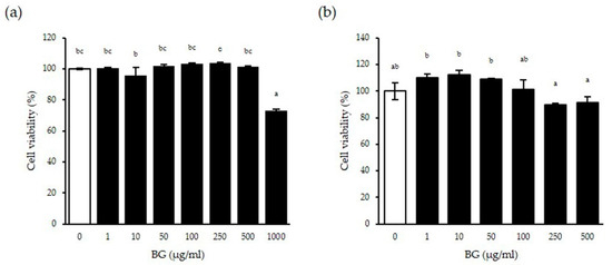 Cell viability was performed using the water-soluble tetrazolium (WST) assay kit (EZ Cytox, Daeil Lab Service Co. Ltd., Seoul, Korea) according to the manufacturer’s instructions. Wild-type (wt) MEF cells were seeded in 96-well cell culture plates (Hyundai Micro Co., Seoul, Korea) at 2.5 × 104 cells/well, and Caco-2 cells were seeded in 96-well cell culture plates at 5 × 104 cells/well. The cells were pretreated with BG (0, 1, 10, 50, 100, 250, 500 µg/mL) for 24 h or 48 h. Cytotoxicity was quantified after 4 h by measuring the absorbance at 450 nm with a microplate reader (xMark™ microplate absorbance spectrophotometer, Bio-Rad Inc., Hercules, CA, USA). The survival rate of cells at the indicated treatment concentration is expressed as a percentage (%) based on the survival rate of the untreated control group.