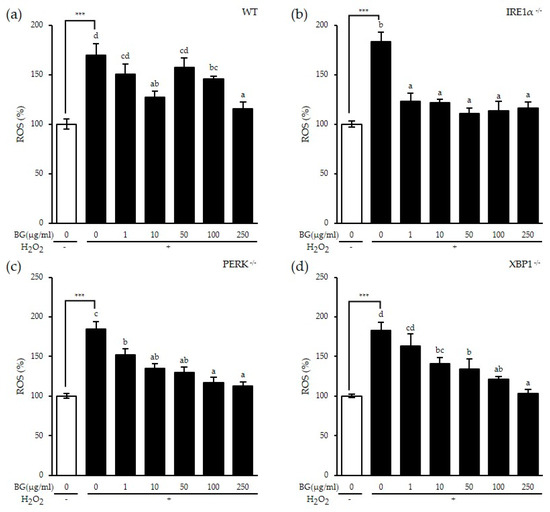Inhibitory effect of BG on H2O2-induced reactive oxygen species (ROS) production in an IRE1α-dependent way. The (a) wt, (b) IRE1α KO, (c) PERK KO and (d) XBP1 KO MEF cell lines were pretreated with various concentrations of BG for 24 h followed by H2O2 stimulation for an additional 1 h. ROS level was determined using 2′, 7′-dichlorofluorescein diacetate (DCFH-DA) analysis. Data are shown as the means ± SD of three independent experiments. Significant differences between different concentrations were analyzed using Duncan’s multiple range test with one-way ANOVA and values labeled with different letters are significantly different (p < 0.05). Student’s t-test was performed to assess the difference between the control group and the H2O2-treated group in the absence of BG. *** p < 0.001. White bar represents negative control. BG, black ginseng.