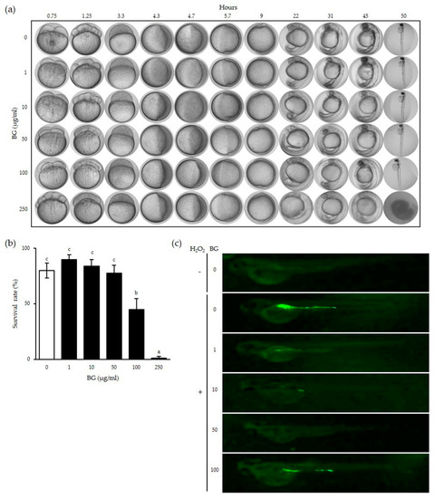 For ROS measurement in vivo, zebrafish embryos at 8 hpf were isolated in 24-well plates at 10 embryos/well with egg water supplemented with 0.1% methylene blue, treated with BG (0, 1, 10, 50, 100, 250 µg/mL) for 1 h, and 5 mM H2O2 was added for an additional 24 h to induce ROS. After incubation, the embryos were washed with egg water and grown to 2-day post fertilization (dpf). At 2 dpf, the eggs were treated with egg water containing DCFH-DA (20 μg/mL), incubated for 1 h at 28 °C in the dark, and then washed with egg water. Images of stained embryos were observed using a digital microscope (Dino-Lite Digital Microscope, ANMO Electronics Co., New Taipei City, Taiwan).