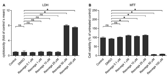 The effect of Resvega (0.1–100 μM; dimethyl sulfoxide (DMSO) 0.5% v/v) on the cell viability in ARPE-19 cells. Rupturing of the cell membrane is indicated by the lactate dehydrogenase (LDH) assay (A), and metabolic activity using the 3-(4,5-dimethylthiazol-2-yl)-2,5-diphenyltetrazolium bromide (MTT) assay (B). Results are compared to the untreated control group, which was set to be 1 (A) or 100% (B). Resvega was diluted by DMSO which served as the diluent control to Resvega. Data were collected from 1 experiment containing 4 parallel samples per group. Results are shown as mean ± standard error of mean (SEM) and were analyzed using the Mann–Whitney U-test. * p < 0.05, ns—not significant.