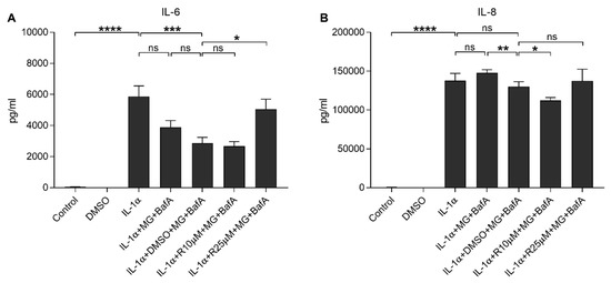 The effect of Resvega (R10–25 μM; DMSO 0.5% v/v) on the secretion of inflammatory cytokines IL-6 (A) and IL-8 (B) upon MG-132 (MG; 5 μM) and bafilomycin A1 (BafA; 50 nM) exposure in IL-1α-primed ARPE-19 cells. Resvega was diluted by DMSO which served as the diluent control to Resvega. Untreated cells served as controls for IL-1α-primed cells, and IL-1α for IL-1α-primed cells with inflammasome activators MG-132 and BafA. Data are combined from 3 independent experiments containing 4 parallel samples per group in each experiment. Results are shown as mean ± SEM and analyzed using the Mann–Whitney U-test. * p < 0.05, ** p < 0.01, *** p < 0.001, **** p < 0.0001, ns—not significant.