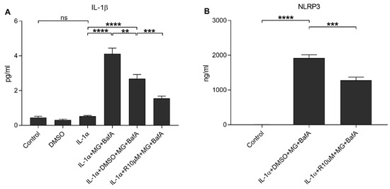 The effect of Resvega (R10 μM; DMSO 0.5% v/v) on the secretion of IL-1β (A) and NLRP3 (B) upon MG-132 (MG; 5 μM) and bafilomycin A1 (BafA; 50 nM) exposure in IL-1α-primed ARPE-19 cells. Resvega was diluted by DMSO which served as the diluent control to Resvega. Untreated cells served as controls for IL-1α-primed cells, and IL-1α for IL-1α-primed cells with inflammasome activators MG-132 and BafA. Data are combined from 3 independent experiments containing 4 (A) or 3 (B) parallel samples per group in each experiment. Results are shown as mean ± SEM and analyzed using the Mann–Whitney U-test. ** p < 0.01, *** p < 0.001, **** p < 0.0001, ns—not significant.