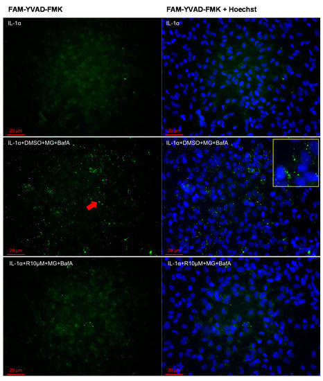 The effect of Resvega (R10 μM; DMSO 1% v/v) on the caspase-1 activity in conjunction with MG-132 (MG; 5 μM) and bafilomycin A1 (BafA; 50 nM) exposure in IL-1α-primed ARPE-19 cells. The caspase-1 activity was investigated using a specific fluorochrome inhibitor of caspase-1 (FLICA, FAM-YVAD-FMK) and detected in a fluorescent microscope (Zeiss ApoTome.2 Imager M2 microscope). A green fluorescent signal (pointed as an example by a red arrow) indicates the presence of active caspase-1 attached to the FAM-YVAD-FMK-probe. Nuclei were stained using the blue Hoechst 33342 dye. Resvega was diluted by DMSO which served as the diluent control to Resvega, and IL-1α for IL-1α-primed cells with inflammasome activators MG-132 and BafA. One representative picture is presented from each group (a more extensive combination of pictures is included in the Supplementary Materials; Figures S1–S3).