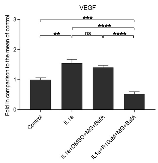 The effect of Resvega (R10 μM; DMSO 0.5% v/v) on the vascular endothelial growth factor (VEGF) secretion in IL-1α-primed ARPE-19 cells treated with MG-132 (MG; 5 μM) and bafilomycin A1 (BafA; 50 nM). Results are compared to the untreated control group, which was set to be 1. Resvega was diluted by DMSO which served as the diluent control to Resvega. Untreated cells served as controls for IL-1α-primed cells, and IL-1α for IL-1α-primed cells with inflammasome activators MG-132 and BafA. Data are combined from 3 independent experiments containing 3 parallel samples per group in each experiment. Results are shown as mean ± SEM and analyzed using the Mann–Whitney U-test. ** p < 0.01, *** p < 0.001, **** p < 0.0001, ns—not significant.