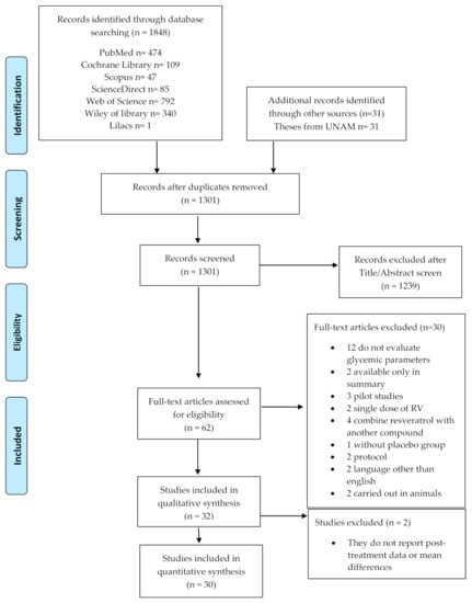A literature search was carried out in the following databases: PubMed-Medline; Scopus; Cochrane library; Web of Science; Wiley online library; ScienceDirect; and Lilacs. The search was carried out among all articles published from January 1980 to 31 May 2020. The following search strategy was used: Resveratrol AND (glycemic control OR fasting glucose OR insulin resistance). A National Autonomous University of Mexico (UNAM) thesis search was also carried out to identify unpublished studies that could potentially be included in the review. Titles and abstracts identified through the search strategy were independently assessed by two reviewers (B.I.G.-M. and M.R.-R.), and discrepancies were resolved by a third reviewer (V.M.M.-N.). Once the titles and abstracts that met the selection criteria had been selected, the full texts of potentially relevant articles for the review were retrieved and an exhaustive review was carried out to select the definitive studies.