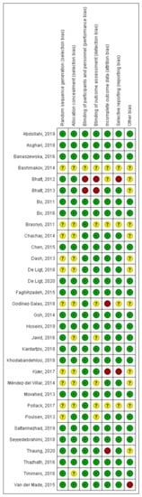 After retrieving the full text of the selected studies, they were reviewed in detail to eliminate those that did not meet the inclusion criteria, in addition to assessing their methodological quality. For this purpose, the Cochrane collaboration risk of bias assessment tool was used. This tool considers seven items for evaluation, including the generation of the random sequence, allocation concealment, blinding of staff and participants, blinding of the analysis of results, incomplete results data, selective reports of results, and other sources of bias.