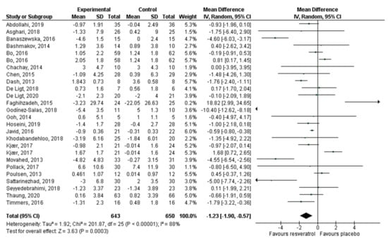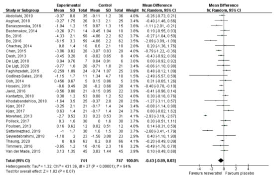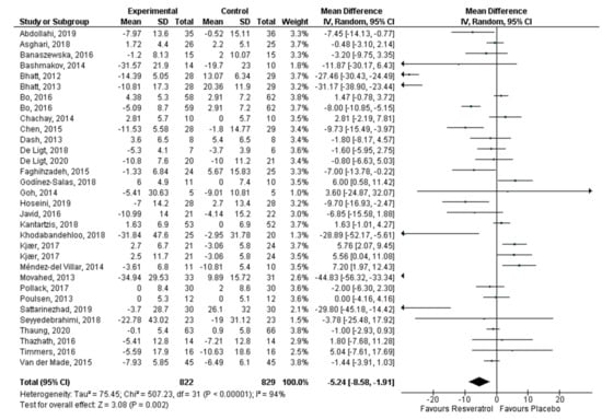 Thirty articles that reported 32 effect sizes were included for the meta-analysis that evaluated the effect of RV on glucose levels, 24 publications with 26 effect sizes for insulin, 16 articles with 17 effect sizes of RV on HbA1c, and 26 studies with 28 effect sizes on HOMA-IR. There was a statistically significant decrease of glucose (−5.24 mg/dL, p = 0.002; Figure 3) and insulin levels (−1.23 mIU/L, p = 0.0003; Figure 4). HbA1c (Figure 5) and HOMA-IR (Figure 6) did not show significant changes. Due to the considerable heterogeneity of the included studies, sub-analyzes were performed (Table 2). Sub-analysis by dose revealed that glucose levels improve significantly after the administration of 500–1000 mg/day of RV (−7.54 mg/dL, p = 0.002), while insulin improves with doses lower than 500 mg/day (−1.43 mIU/L, p = 0.01) and with doses greater than 1000 mg/day (−2.12 mIU/L, p = 0.03). HbA1c and HOMA-IR remained unchanged after sub-analysis by dose.
