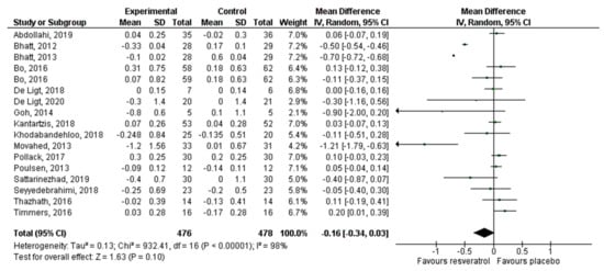 These results are in contrast to the findings of Crandall et al. [79] and Witte et al. [80], who found that RV administration in older adults improves the insulin sensitivity, plasma glucose, and glucose metabolism. However, in the clinical trials included in our meta-analysis, which were conducted in subjects under 45 years of age (Asghari et al.; Bo et al.; Godínez-Salas et al.; Poulsen et al. [19,25,33,43]), it was observed that glycemic control markers did not change. Moreover, among clinical trials with people older than 60 years, only Hoseini et al. [35] reported a significant change in glucose levels after an intervention with 500 mg/day of RV for 4 weeks. Most of the studies where the age of the participants ranged between 45 and 59 years found significant changes in the biomarkers of glycemic control, except those with low doses of RV (Kantartzis et al. [37]) or short intervention periods (Dash et al. [29]).