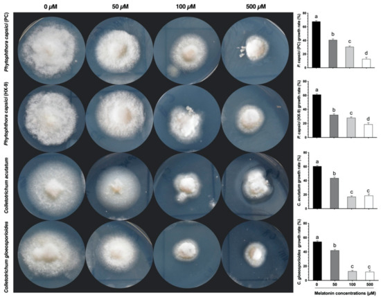 An assay of antifungal activity was determined under sterile conditions using a hyphal extension-inhibition assay with a little modification [52]. A 5 mm mycelium plug of the tested fungi from an actively growing plate was inoculated into the center of a petri-dish containing potato dextrose agar (PDA) medium and different concentrations (0, 50, 100, and 500 µM) of melatonin. The plates were incubated at 28 °C for 3 days to observe the extension–inhibition of hyphae and then quantified using the ImageJ tool and photographed [53]. The major phytopathogenic fungi used in the current research included Colletotrichum gloeosporioides (NCBI:txid474922), Colletotrichum acutatum (NCBI:txid27357), and two strains of Phytophthora capsici (NCBI:txid4784). Three biological replicates in three individual experiments were practiced to minimize the error.