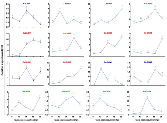 The expression pattern of pepper CBP encoding genes was analyzed under C. gloeosporioides post-infection, based on transcriptomic data [28]. The obtained results showed a differential expression pattern of pepper chitinase genes. All 16 genes were upregulated, and no gene was completely downregulated at all tested points (Figure 2). Initially, at 12 h post-inoculation (hpi) treatment, most of the genes did not show any significant infection response, while >36% of the genes were downregulated, and then expression increased abruptly at 24-hpi. However, 31% of genes (CaChiI1, CaChiIII1, CaChiIII2, CaChiIII4, and CaChiVI7) progressively showed increased transcript levels at each point and reached a peak. Nevertheless, two genes (CaChiI1 and CaChiIV2) showed no substantial transcript level changes against C. gloeosporioides infection and mostly were not upregulated at different intervals. Compared to other chitinase genes, CaChiIII2 and CaChiIII7 exhibited remarkable expression levels, i.e., >57-fold at 48-dpi and >44-fold at 96-dpi, respectively. Thus, they were considered as candidate genes for further investigation of plant resistance against C. gloeosporioides infection. Pepper chitinase class-III genes showed a higher response to C. gloeosporioides than the members of other classes, such as I, IV, and VI (Figure 2). Generally, we found that the CBP gene family is substantially influenced by C. gloeosporioides during a period of inoculation.