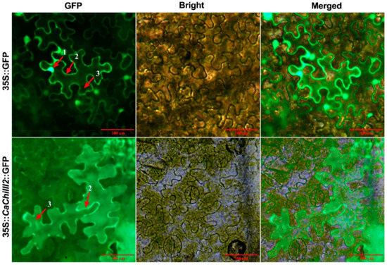 The ORF of CaChiIII2 was fused with green fluorescence protein (GFP) (GFP:CaChiIII2) (Table S5) and for transient expression transferred into pVBG-2307+GFP vector (Figure S3) driven by 35S promoter (CaMV). Tobacco epidermal cells were used for the subcellular analysis of the fused protein. The GV3101 competent cells were harvested and dissolved in 200 μM acetosyringone, 10 mM MES (pH 5.5), and 10 mM MgCl2, and injected into four weeks old leaves of Nicotiana benthamiana through a needleless syringe. The tobacco saplings were retained in the dark for two days and then in the growth chamber for three days. The CaChiIII2 protein was visualized through a microscope (OLYMPUS, Tokyo, Japan).